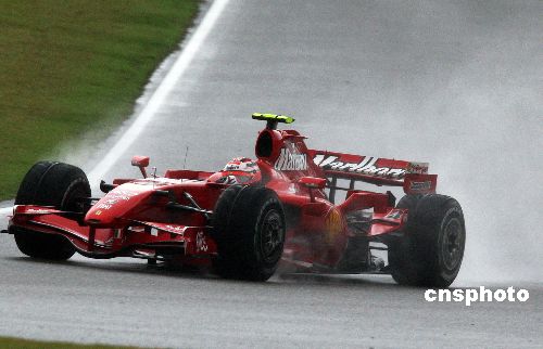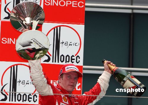 一级方程式(F1)中国大奖赛的正赛10月7日下午在上海赛道进行,法拉利车队的芬兰籍著名车手基米·莱科宁(Kimi Raikkonen)以1小时37分58 秒的成绩获得冠军,第二名为麦凯伦车队的西班牙籍著名车手阿隆索(Fernando Alonso),法拉利车队的车手菲利浦·马萨(Felipe Massa)获得第三名;2007年度F1车手总冠军将在本年度最后一站巴西站决出。中新社发 任晨鸣 摄