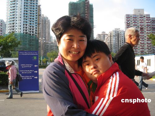 10月10日,上海特奥会五十米跑比赛中最先撞线的特殊“飞人”——二十岁的中国大连特奥运动员苏放,赛后紧紧拥抱住特地从大连赶来的母亲,感谢多年来对他的关爱和支持。由医护车直接送入赛场的苏放在比赛中凭着惊人的毅力,给了所有关爱他的人一个巨大惊喜。中新社发 李佳佳 摄