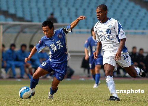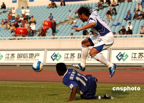 2007年10月20日下午,中甲联赛第25轮的比赛打响。在南京奥体中心体育场进行的一场比赛中,主场作战的江苏队以1比0战胜广州队。中新社发 刘建民 摄