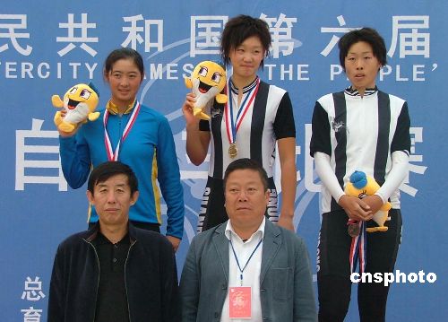 十月二十三日,第六届城市运动会自行车场地赛在河南洛阳新区体育中心开赛,女子三公里个人追逐赛冠军被烟台市队的姜帆(中)夺得,北京顺义队的王翠、烟台队的姜吻吻分获二、三名。中新社发 史宝银 摄