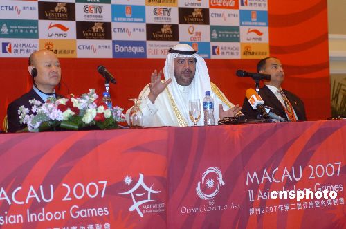 十月二十八日,亚奥理事会主席萨巴赫亲王(中)在澳门第二届亚洲室内运动会记者会上,盛赞第二届亚洲室内运动会的组织工作非常成功,今后会更加成功。中新社发 史利 摄