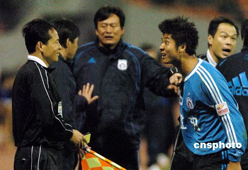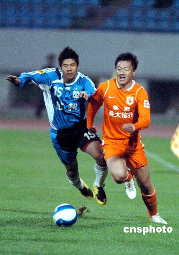 11月1日,2007中国足球超级联赛第27轮在山东济南的一场比赛中,主场作战的山东鲁能泰山队1比1战平大连实德足球队。中新社发 张侃 摄