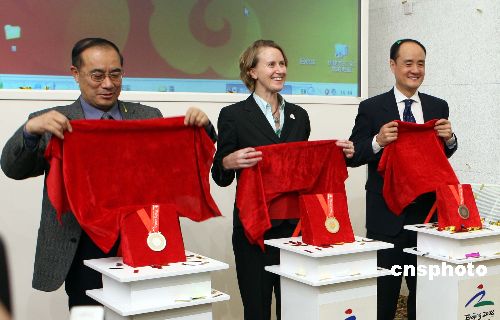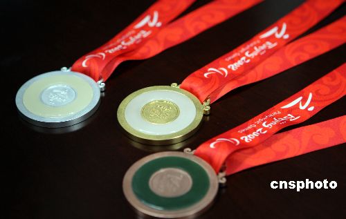 十一月十四日,北京奥组委发布2008年残奥会奖牌式样,其设计创意、造型与北京奥运会奖牌一脉相承,体现了“两个奥运 同样精彩”的要求。残奥会奖牌正面镶玉的设计灵感来自中国古代的玉器造型,中间为北京2008年残奥会会徽;玉的色泽随金、银、铜牌有所变化,分别为白玉、青白玉、青玉。中新社发 任海霞 摄