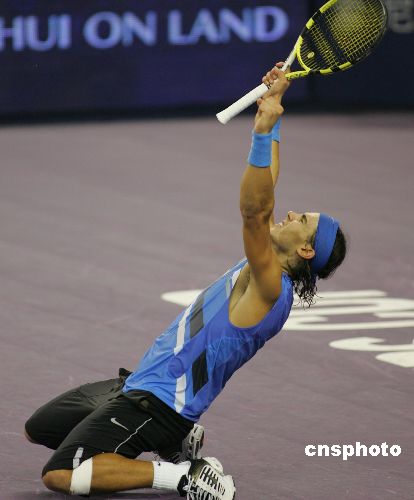 11月15日,在2007年上海大师杯单打金组纳达尔对阵德约科维奇的比赛中,世界二号选手纳达尔以2比0(6比4,6比4)轻取对手。最终,纳达尔在小组赛中以两胜一负的战绩挺进本届大师杯四强。中新社发 汤彦俊 摄