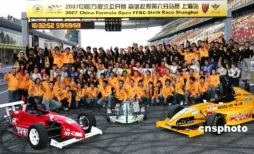 11月24-25日,由香港嘉信控股集团旗下的三大腾飞(北京)方程式运动有限公司承办的2007年中国方程式公开赛收官赛在上海国际赛车场举行,比赛包括威速方程式系列赛和雷诺2000组赛,选手皆为日本、阿根廷、芬兰、香港及中国国内最具实力的车手。图为全体车手和赛事服务人员大合照。中新社发 赵振清 摄