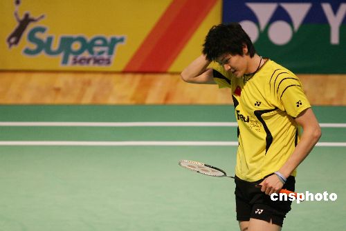 十一月二十九日,二零零七中国香港羽毛球超级赛进行正赛第二轮的比赛,男单三号种子选手鲍春来因为右脚脚踝有伤宣布放弃比赛。中新社发 武仲林 摄