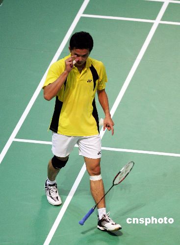 十一月三十日晚,世界排名第一的中国选手林丹在二零零七中国香港羽毛球超级赛上以二比零战胜印尼名将陶菲克,晋级四强。图为陶菲克在比赛中摔拍。中新社发 武仲林 摄