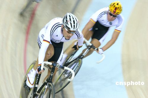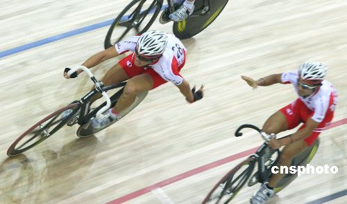 12月9日,“好运北京”2007-2008国际自盟场地自行车世界杯赛在老山自行车馆闭幕。图为最后一项男子麦迪逊40公里的决赛。在男子麦迪逊赛中,每队有两名选手组成,是完成途中冲刺的比赛。根据各队完成比赛的距离和所获得的冲刺得分,可以决定最终的名次。此外,如果一支队伍能够领先其他车队一圈或一圈以上,那无论冲刺得分是多少都将获胜。中新社发 富田 摄