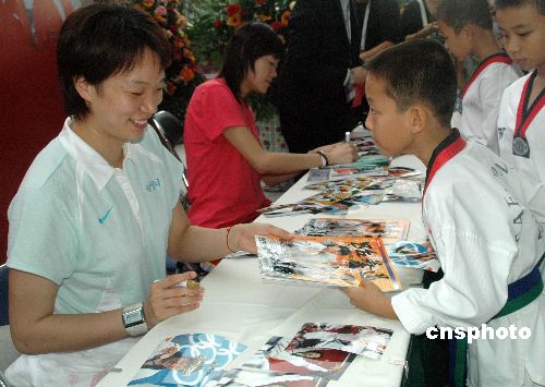 12月12日,前来三亚参加2007“兰海杯”第三届中韩跆拳道对抗赛的奥运冠军陈中、罗薇,在三亚“美丽之冠”进行签赠活动,受到许多跆拳道爱好者的热烈欢迎。中新社发 尹海明 摄