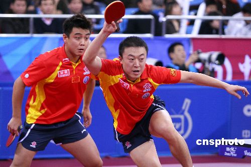 12月15日,2007年度国际乒联职业巡回赛总决赛在北京大学体育馆进入第三个赛日的争夺。在当日下午进行的一场男双半决赛中,郝帅/马龙和王皓/马琳狭路相逢,经过7局苦战,王皓(左)/马琳(右)战胜对手进军决赛。中新社发 富田 摄