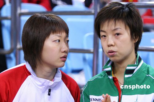 12月15日,“好运北京”大众汽车2007国际乒联职业巡回赛总决赛在北京大学体育馆继续进行,在一场女单1/4决赛中,张怡宁以4-0(11-6,11-4,11-5,11-6)击败新加坡一姐李佳薇,轻松挺进四强。张怡宁与李佳薇有过多次交战,加上两人都曾在北京队学习训练,因此都十分了解对手。图为比赛前两人在场下交流。中新社发 富田 摄