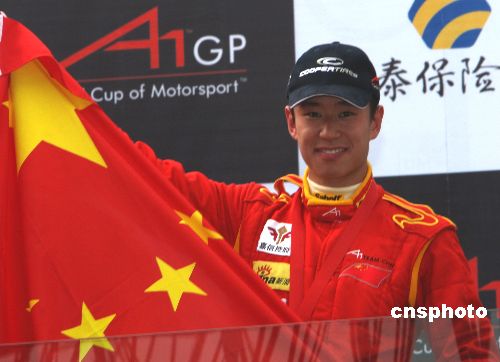 A1GP世界杯汽车大奖赛2007/08赛季中国站12月16日在珠海国际赛车场举行,在冲刺赛的比赛中,A1中国队车手程丛夫表现出色获得第三名,五星红旗高高飘扬珠海国际赛车场。中新社发 赵振清 摄