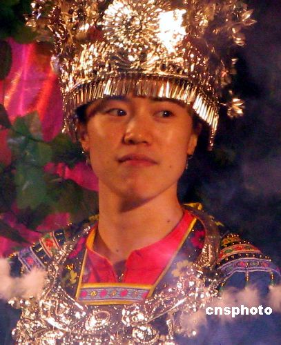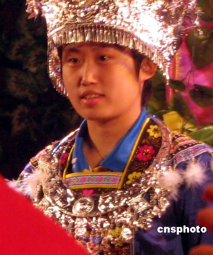 12月24日晚,2007年国际女子乒乓球对抗赛在广西柳州拉开帷幕。赛前所有运动员都身穿当地的民族服装亮相。中新社发 周潇男 摄