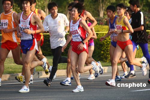 一月五日,厦门国际马拉松赛鸣枪开跑。在女子比赛中,中国选手张莹莹、白雪分获冠亚军,并双双打破赛会女子纪录。著名选手孙英杰(左五)也在禁赛后复出参加了比赛,但状态一般,未进入前八名。中新社发 张永定 摄
