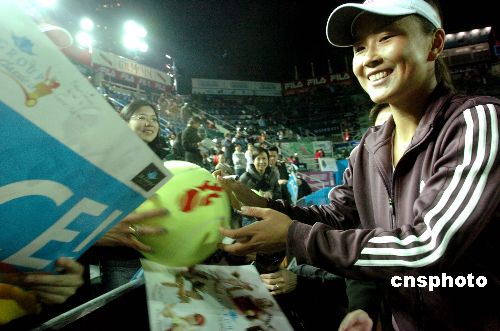 一月五日,彭帅在香港网球精英赛优秀组女子决赛中以二比一战胜沃兹尼亚基,夺得冠军。图为彭帅赛后为观众签名。中新社发 邓庆乐 摄