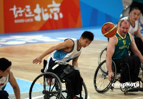 好运北京-2008国际轮椅篮球邀请赛,1月20日在北京奥运会主要赛场-国家体育馆举行。此次赛事的主旨是全面检测北京残奥会比赛的各个环节,北京残奥会的轮椅篮球赛事就在该体育馆举行。图为世界劲旅澳大利亚队(绿)与中国队在男子比赛中。中新社发 任晨鸣 摄