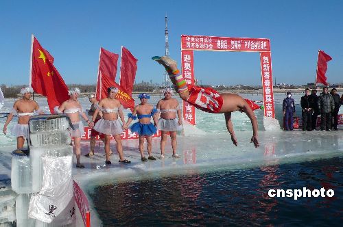 1月27日,黑河市冬泳俱乐部、俄罗斯远东冬泳俱乐部联合在黑龙江畔举办“迎奥运,贺新春、强体魄、促和谐”为主题的系列体育竞赛活动。当日,黑河冬泳俱乐部的队员们身着自制的芭蕾服装偏偏起舞,他们还和俄罗斯远东冬泳俱乐部共计200余名队员,先后进行了“与奥运同行”沿黑龙江江堤徒步宣传活动、雪地足球对抗赛、冬泳表演等系列体育竞赛活动,表达了边城健儿们向往2008奥运会的共同愿望和对全国人民新春佳节美好祝福。据悉,参加本次活动最大年龄的队员为75岁。中新社发 邱齐龙 摄