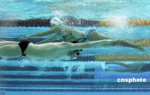 1月29日,参加好运北京——中国游泳公开赛的各国选手在刚刚落成的北京奥运会游泳场馆——国家游泳馆(水立方)内训练。为了全面检测水立方的功能,中国游泳公开赛将于1月31日在这里举行。中新社发 任晨鸣 摄