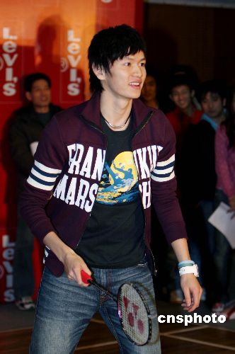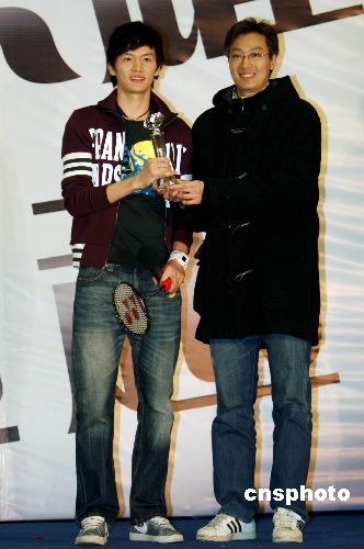 1月29日,北京某品牌服饰请来潮流天王陈冠希及内地知名设计师樊小博分别设计限量Sports概念Tee。在发布会现场,主办方特别邀请了2008年奥运金牌有力竞争者——羽毛球国手鲍春来出席宣传活动。中新社发 袁方 摄