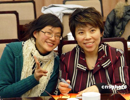 1月30日,奥运冠军邓亚萍、叶乔波出席一项以“携手海峡·走近奥运”为主题的台湾大学生冬令营闭营式。邓亚萍在北京奥运贺年卡上为台湾大学生签名留念。两位知名运动员当天与台湾同学们讨论奥运场馆建设,力荐北京各类特色建筑。中新社发 刘舒凌 摄