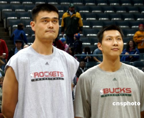 当地时间二月二日,由姚明领军的NBA休斯顿火箭队作客密尔沃基,挑战另一位中国球员易建联所效力的雄鹿队。此为火箭和雄鹿在本赛季的第二次交锋。姚明(左)和易建联(右)赛前互致问候并合影。中新社发 李静 摄