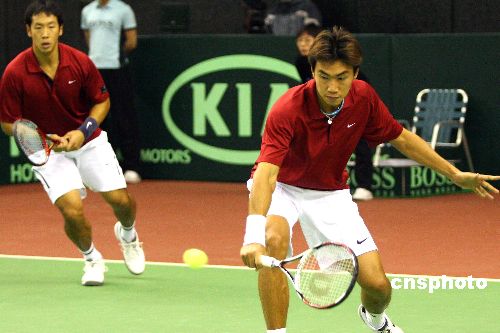 2月9日,2008年戴维斯杯亚大区II组中国队vs黎巴嫩队比赛在北京国际网球中心进行了第三场双打比赛的较量。于欣源/曾少昡 以6:2,7:6(4),6:2战胜黎巴嫩的吉桑·扎阿蒂尼/帕蒂克·楚克里双打组合。尽管后两场单打还没进行,中国队总比分3:0已经确保胜利晋级下轮。中新社发 富田 摄