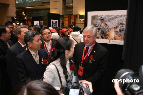当地时间二月九日上午,巡回世界的“新北京、新奥运”北京奥运图片展在加拿大温哥华市中心开幕。图为加拿大联邦政府国际贸易部长艾民信(右)等政府官员参观展览。预计二十一天的展出将至少吸引三万名观众,两年后将主办冬奥会的温哥华正在掀起新的奥运高潮。中新社发 吕振亚 摄