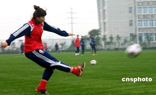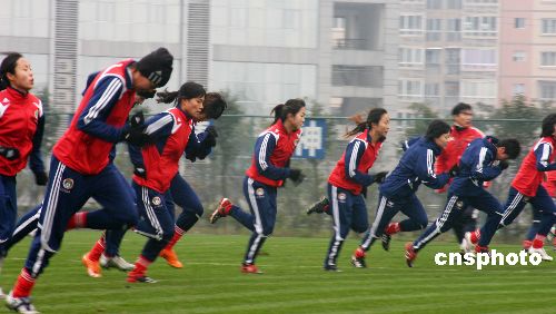2月14日上午,中国女足的28名队员在主教练伊丽莎白、领队张建强的率领下,来到重庆文理学院足球训练场进行角球、破门等技战术训练。中新社发 陈仕川 摄