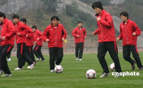 2月16日下午,朝鲜女足在永川备战四国赛。当日,朝鲜女足主教练金光明带领21名弟子出现在重庆财经职业学院足球训练场进行首场集训。据了解,夺冠呼声高的朝鲜女足15日晚7时多抵达下塌的永川名豪国际酒店,她们是最后一支抵达永川的球队。2008东亚女足锦标赛决赛将于2月18日在永川体育中心开赛。中新社发 陈仕川 摄