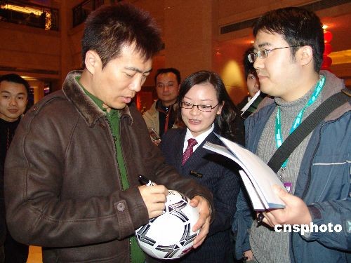 2月17日晚,著名足球解说员黄健翔在永川球迷的簇拥下从重庆江北机场抵达下塌的永川名豪国际酒店,受到媒体记者及球迷的欢迎。据了解,黄健翔回故乡永川,是为了参加2008东亚女足锦标赛决赛和回老家祭祖。中新社发 陈仕川 摄