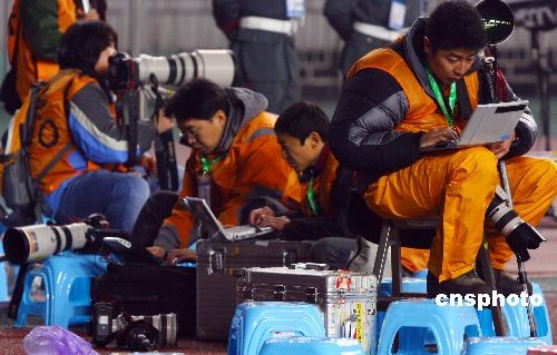 2月17日,2008东亚足球锦标赛揭幕战在中国重庆打响。揭幕战中,中国队未能打破“恐韩”魔咒,以2:3惜败于韩国,日本则与朝鲜队1:1战平,中国队排名暂时位居末位。图为球赛中场休息时,记者们在场边争分夺秒发稿。中新社发 郭晋嘉 摄