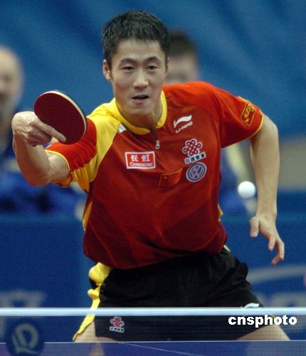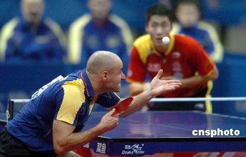 2月25日晚,第49届世乒赛团体赛进入第二天的争夺,中国男队迎战小组赛中的罗马尼亚队。王励勤在首场比赛中以1比3负于世界排名97位的菲利蒙。中国队出场的另外两运动员陈玘和王皓分别战胜对手,最终中国队3比1胜罗马尼亚队。中新社发 吴峻 摄