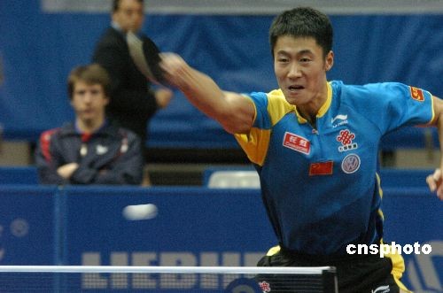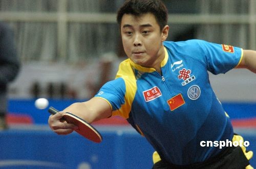 二月二十六日,第四十九届世界乒乓球锦标赛男子团体赛在广州进行第三轮角逐,中国队的王励勤、马琳、王皓组成豪华阵容,以三比零完胜对手克罗地亚队,取得小组赛三连胜。中新社发 柯小军 摄