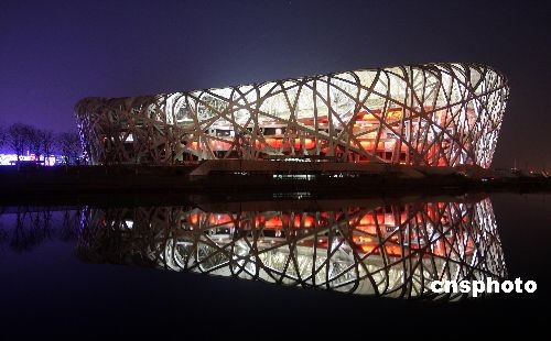 3月4日晚,中国国家体育场“鸟巢”灯火辉煌。由于目前还只是临时供电,因此所有的灯光都处于调试阶段,东西两半部只能轮流亮灯。而第一批3000多盏中国红剪影灯还只是“鸟巢”夜景设置的第一步。中新社发 郑雄增 摄