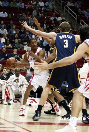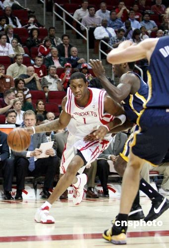 当地时间3月5日晚,休斯敦火箭队坐镇主场,在缺少姚明的情况下,以117比99大胜印地安那步行者队豪取16连胜,刷新了球队41年历史上的最长连胜纪录。图为火箭灵魂人物麦迪带球突破。中新社发 杨晋升 摄