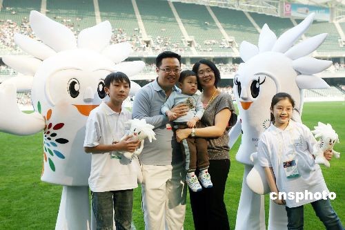 三月九日,市民在香港大球场与二零零九东亚运动会吉祥物“东仔”、 “亚妹”合影留念。当日,香港有史以来举办的最大型国际运动会——二零零九东亚运动会吉祥物正式揭幕,吉祥物以“火”及“狮子”为概念,表达香港人自强不息的拼搏精神。中新社发 武仲林 摄