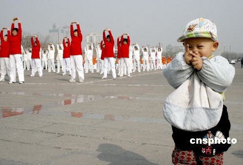 2008年3月10日,北京市海淀区委、区体委与甘家口街道办事处联合组织的“万人健身迎奥运”活动在中央电视塔下举行。中新社发 黄小兵 摄