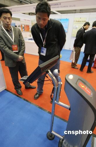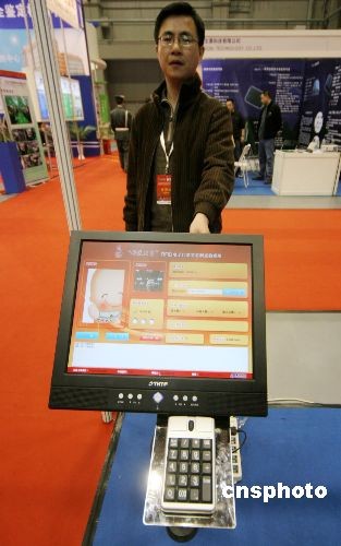 3月23日,一位工作人员在演示奥运会电子门票实名制检票系统。当天,2008年第10届中国国际智能标签(RFID)与智能卡展览会暨应用大会在北京国贸举行。据工作人员介绍,观众将手中的“奥运会电子门票”放到仪器上一扫,不到一秒钟时间,显示屏上就出现了带有观众本人照片的一系列相关信息,照片约名片大小,可以清楚地辨认并与本人进行比对。如果一切信息无误,系统则亮绿灯,观众方可入场。 中新社发 吴芒子 摄