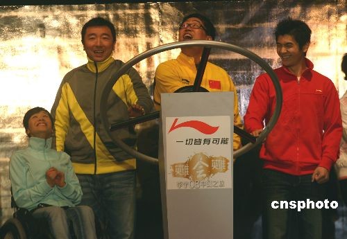 3月22日,“李宁零八中国之旅”活动在北京朝阳公园启动,该活动将通过“大篷车”巡游的形式,历时9个月,行程4万公里,途经全国近百座中型城市宣传奥运精神、大屏幕直播北京奥运会比赛,并开展三加一篮球挑战赛等一系列全民健身活动。 图为前中国体操队选手桑兰(左一)、奥运冠军杨凌(左二)、邢傲伟(左四)等在启动仪式上。中新社发 沈晨 摄