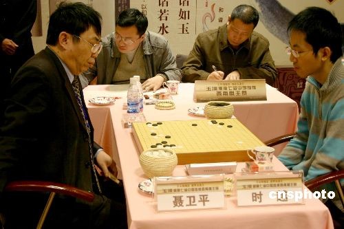 3月25日,“玉溪杯”中国围棋西南棋王赛在成都开战,来自川、贵、渝、滇四支围棋队的16位强手纹枰争战,角逐新一届“西南王”。中国棋界泰斗聂卫平九段是该赛事的常客。图为聂卫平九段首轮(左一)对阵小棋手时越。中新社发 杨杰 摄