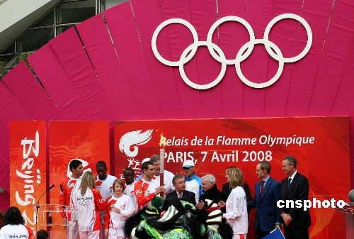 法国巴黎时间7日17时40分(北京时间23时40分),北京奥运会圣火传递到巴黎市夏洛蒂体育场,完成了在巴黎的传递。中新社发 吴卫中 摄