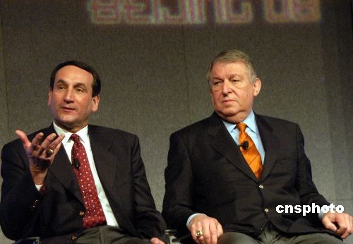 美国男篮主教练迈克·沙舍夫斯基(左)15日与美国篮球国家队组建委员会主席科兰杰洛(右)一同在芝加哥出席美国奥运代表队新闻峰会时称:“美国人必须赢”的观念已经过时,此次奥运夺金并非美国男篮的唯一目标。 中新社发 李静 摄