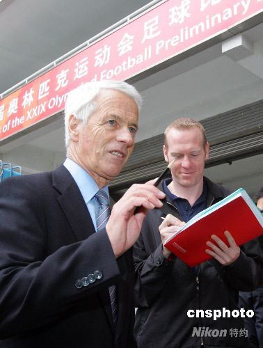 4月22日,国际足联考察团一行在北京奥组委官员的陪同下抵达上海,对08奥运足球上海赛区筹备工作进行考察。图为国际足联竞赛部官员瓦特·西伯(左)和约翰·舒马赫在上海考察奥运足球赛场。中新社发 汤彦俊 摄