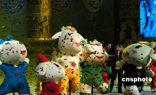 二十八日晚,广州亚运会吉祥物在白云国际会展中心发布。吉祥物取名“乐羊羊”,形象是运动时尚的五只羊,分别取名“阿祥”、“阿和”、“阿如”、“阿意”、“乐羊羊”,组成“祥和如意乐洋洋”,表达了广州亚运会将给亚洲人民带来“吉祥、和谐、幸福、圆满和快乐”的美好祝愿,同时也传达该届运动会“和谐、激情”的理念。中新社发 柯小军 摄