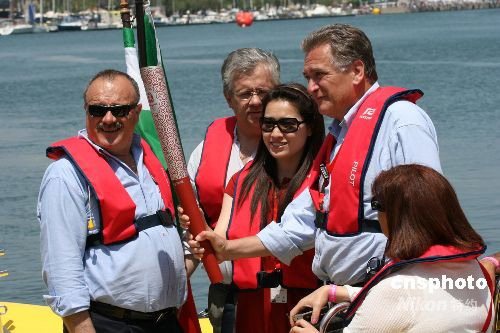 葡萄牙当地时间5月4日下午,F1摩托艇世锦赛葡萄牙站比赛在葡萄牙波尔蒂芒举行,北京2008奥运火炬手罗雪娟带着她收藏的“祥云”奥运火炬来到F1赛场,在赛场会议上罗雪娟和国际摩联F1委员会主席尼克鲁共同呼吁:“崇尚体育精神、支持北京奥运”。在本次2008F1摩托艇世锦赛决赛前,罗雪娟和她收藏的“祥云”火炬被国际摩联邀请到巡游艇上,进行赛前绕场一周巡游。这是奥运火炬首次出现在F1赛场。中新社发 北京泓鼎 摄