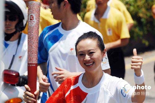 5月8日中午,奥运火炬接力传递在深圳举行,前奥运会体操冠军肖俊峰、2011年世界大学生运动会形象大使戴菲菲(图中)、11次打破女子撑杆跳高世界纪录的孙彩云等社会各界208名火炬手穿越深圳。中新社发 陈文 摄