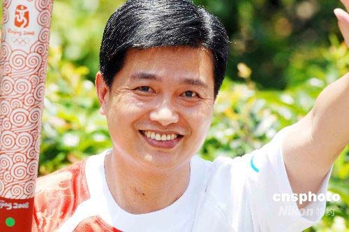 5月8日中午,奥运火炬接力传递在深圳举行,社会各界208名火炬手穿越深圳。图为深圳第一位打破世界纪录的运动员韩星元在第四棒火炬传递中。中新社发 陈文 摄