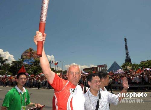 5月8日,奥运圣火在深圳进行传递。在深圳世界之窗门前芬兰籍火炬手芬兰前奥委会主任塔帕尼·爱尔卡同深圳市民同乐祥云火炬。中新社发 廖攀 摄