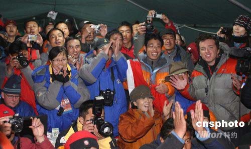 图:圣火登顶 珠峰大本营内激动的面孔
