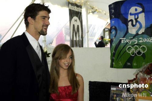 当地时间5月10日晚在巴尔的摩游泳俱乐部举行的“巴尔的摩北京奥运夺金倒计时”筹款晚会上,上届奥运曾经为美国队夺得六枚金牌的美国游泳男一号种子选手迈克尔·费尔普斯被众多来宾争相邀请合影。图为一名美国少女争取机会和迈克尔合影。中新社发 邱江波 摄
